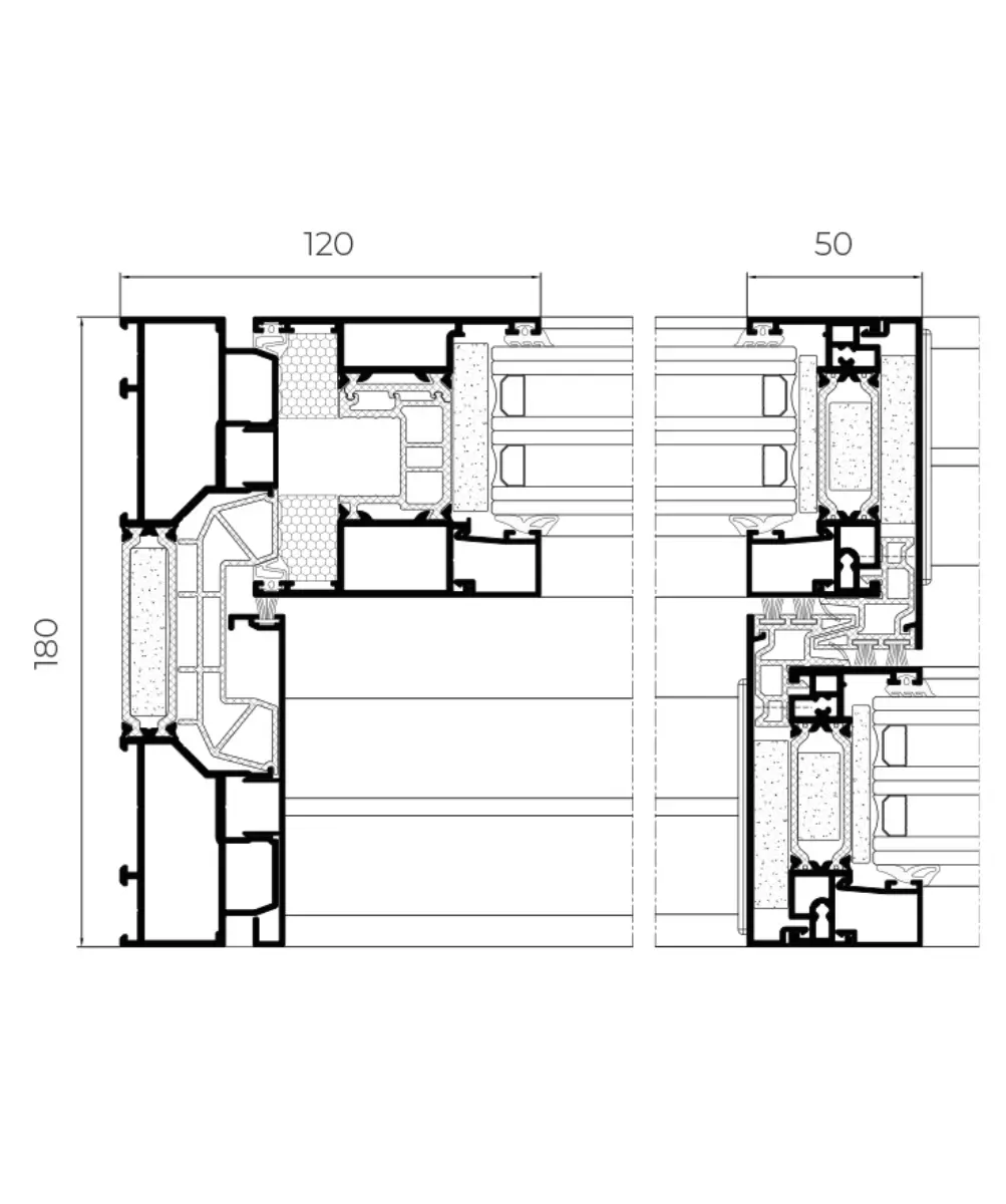 • Caixilho 180 mm / 280 mm de três calhas /380 mm de quatro calhas; Folha 80 mm