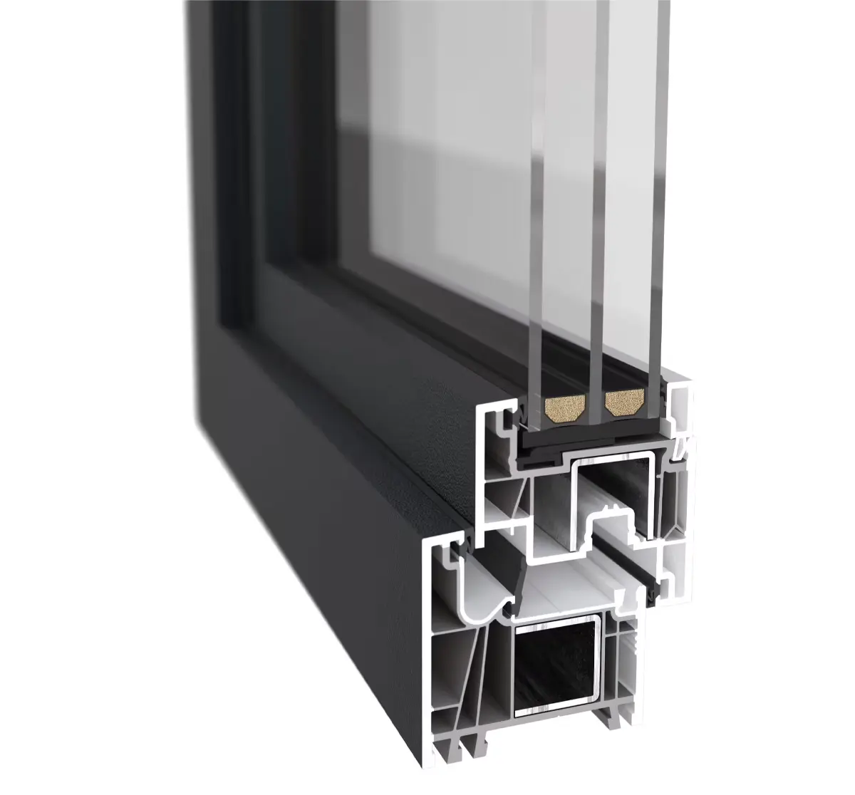 Sistema que graças à construção multicâmara, as portas cumprem os mais elevados padrões de isolamento térmico, isolamento acústico e estabilidade. Ampla usabilidade e design moderno.