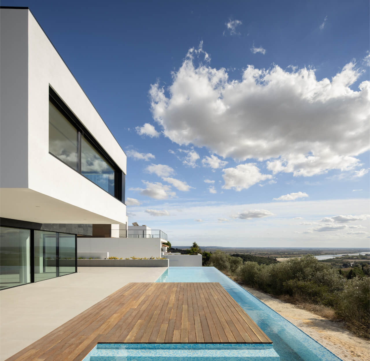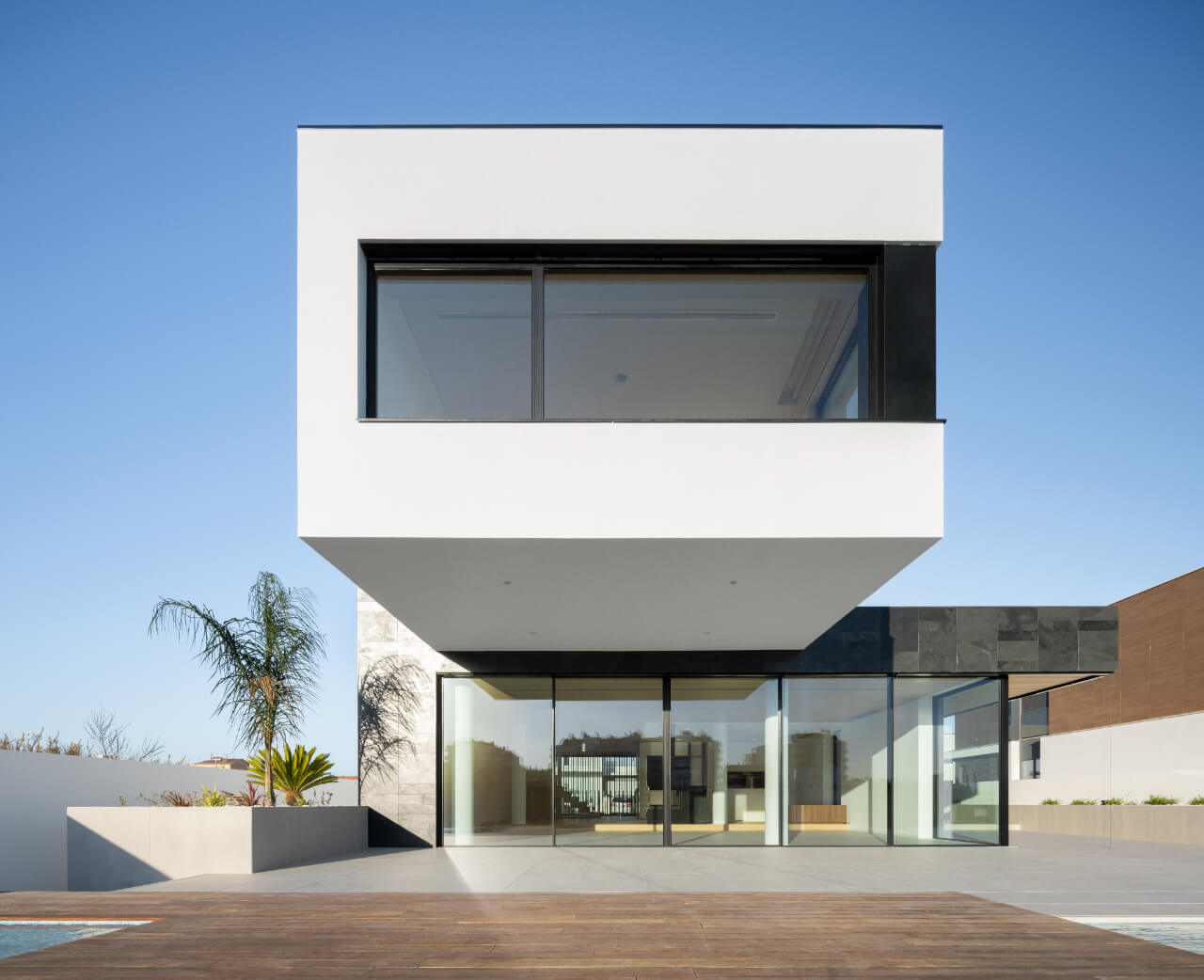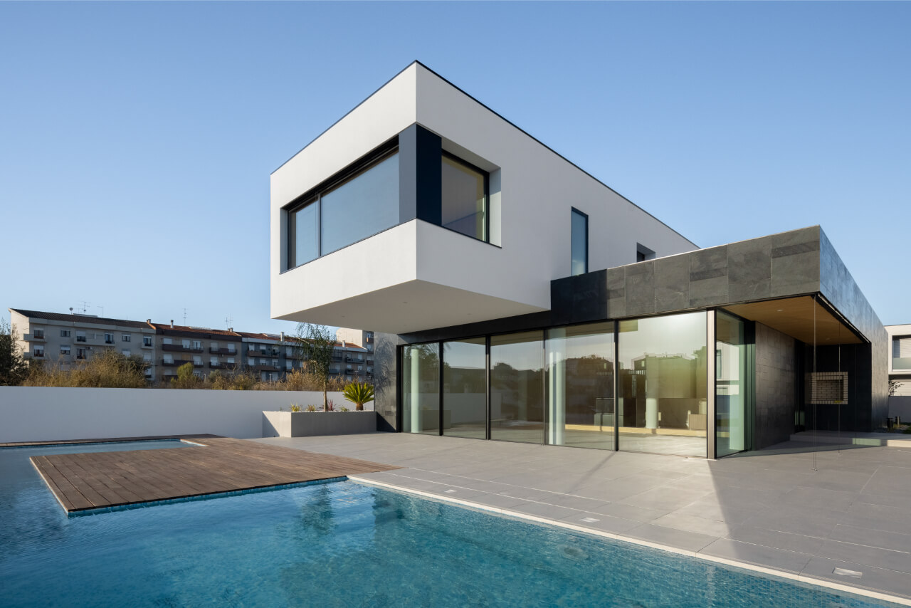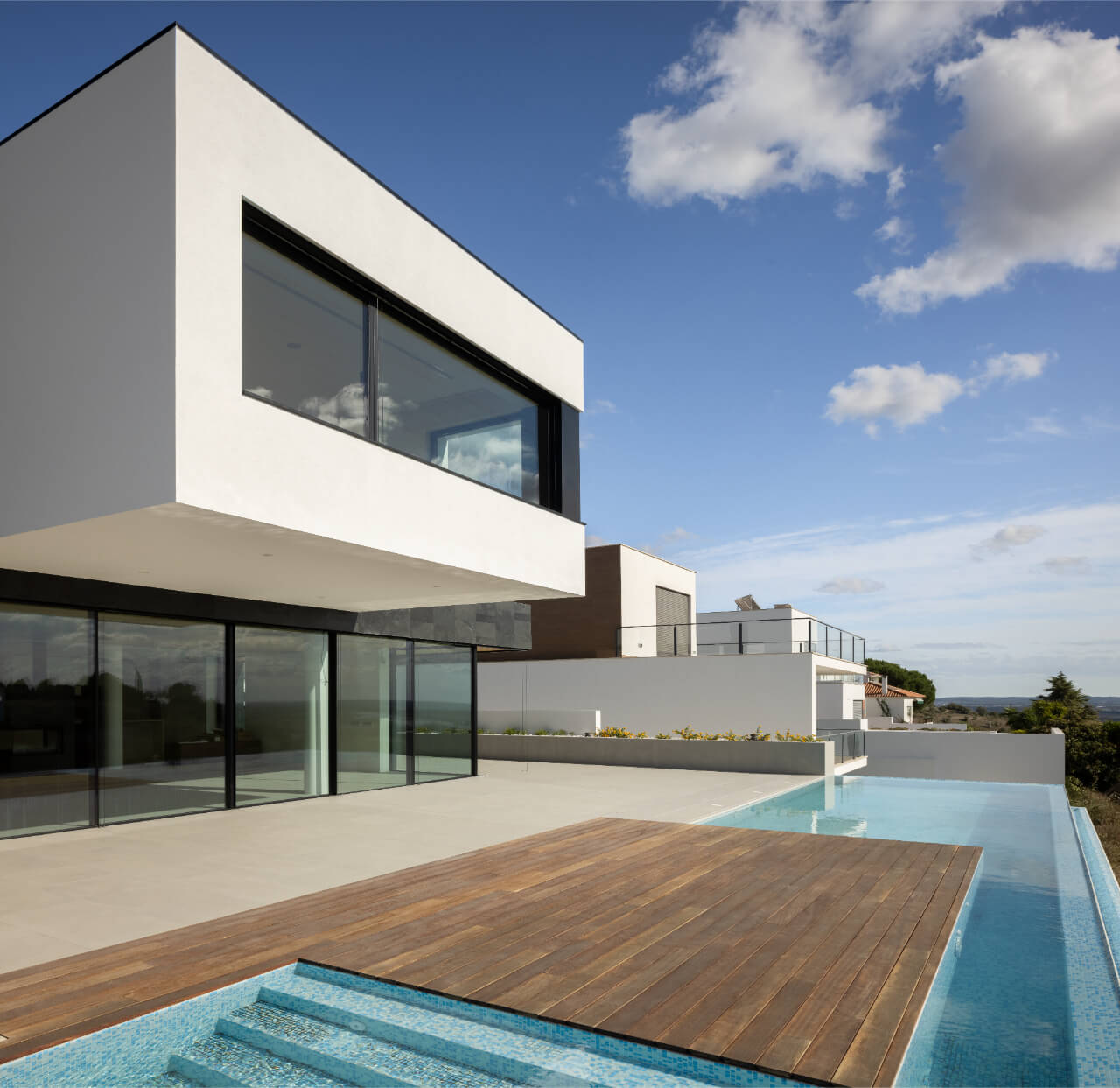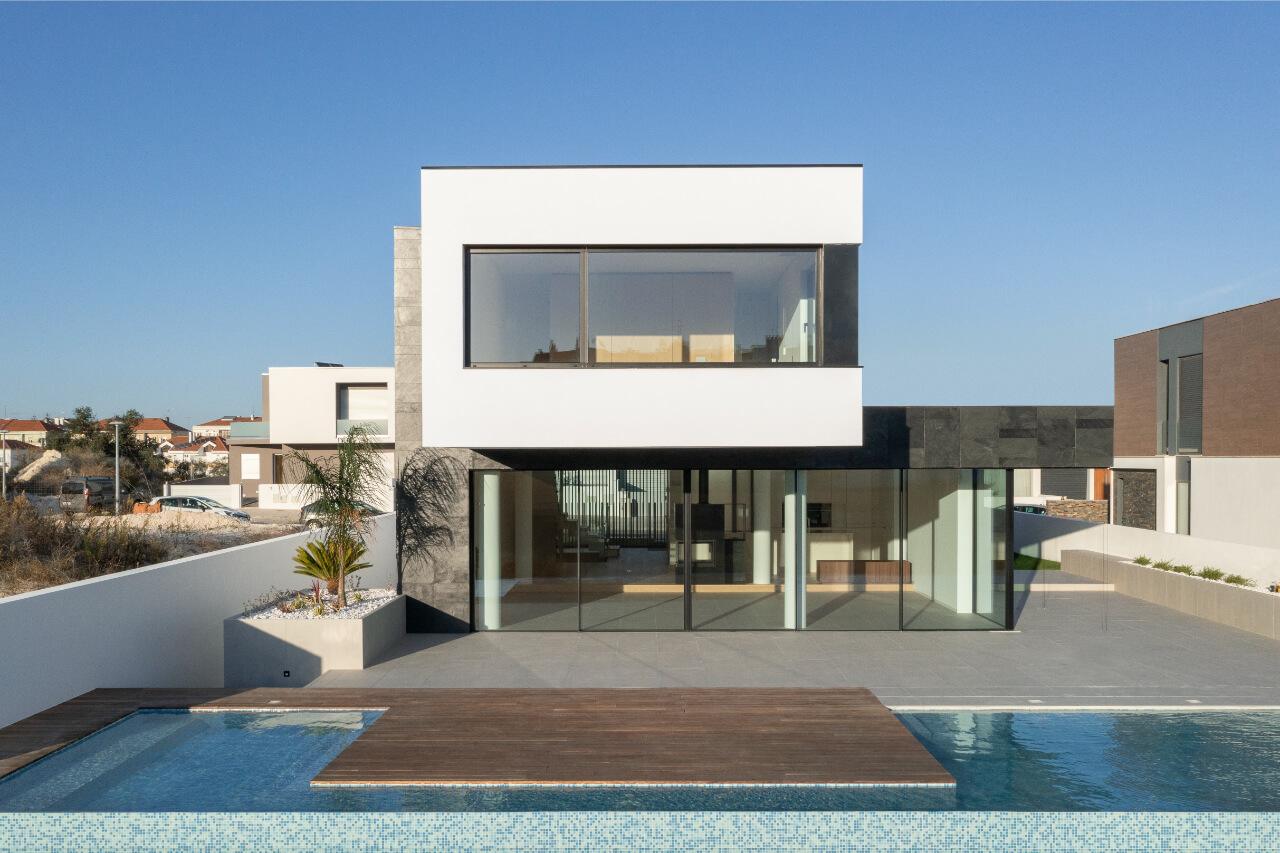 Nova construção residencial onde a Alu-M interveio em todos os vãos: janelas, portas, portadas, fixos e brisas solares. Os sistemas Cortizo e o vidro duplo Planitherm em alumínio anodizado natural combinam design moderno, desempenho técnico e eficiência energética.